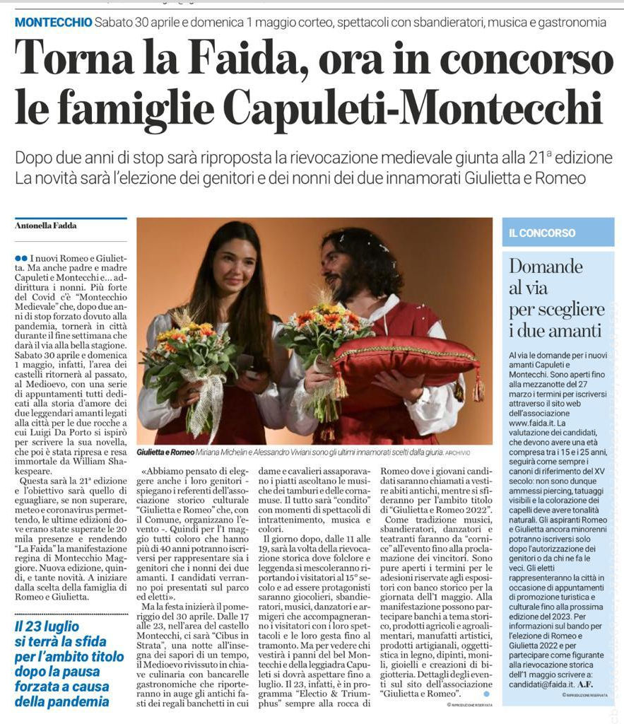 La Faida – Montecchi e Capuleti torna a far parlare di sé anche sulla stampa. Nei giorni scorsi è infatti uscito un nuovo articolo di giornale dedicato alla rievocazione storica di Montecchio Maggiore e ai protagonisti dell’edizione, con un focus speciale sui nuovi Giulietta e Romeo e sulle famiglie Capuleti e Montecchi.